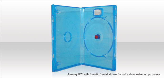 Amaray II™ is a premium DVD packaging system ideally suited for Blu-ray® titles with full double overlapping walls, push-button hub design secures disc in disc well where it is most protected and completely ejects disc out of the well when pushed, shark fin on the spine wall assists disc retention in the well when the case is closed, literature tabs for booklets, and available snap in lid side tray to convert single into a side-by-side dual capacity. There is even a Maglock security option that can added if a security feature is needed. A complete premium packaging system that protects your catalog investment and is able to adjust to your needs as they change, the Amaray II™ is an obvious choice.